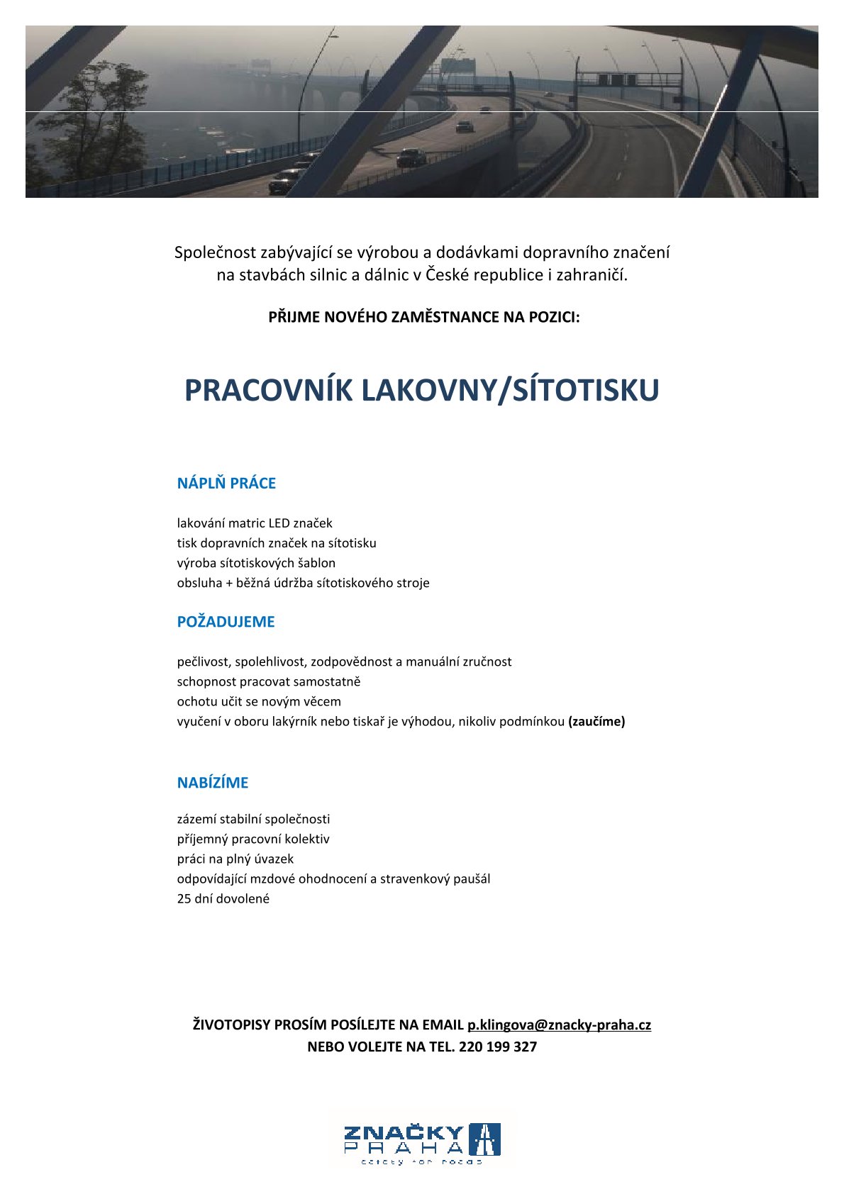 Inzerát - Volné pracovní místo ve firmě Značky Praha s.r.o. - Statenice